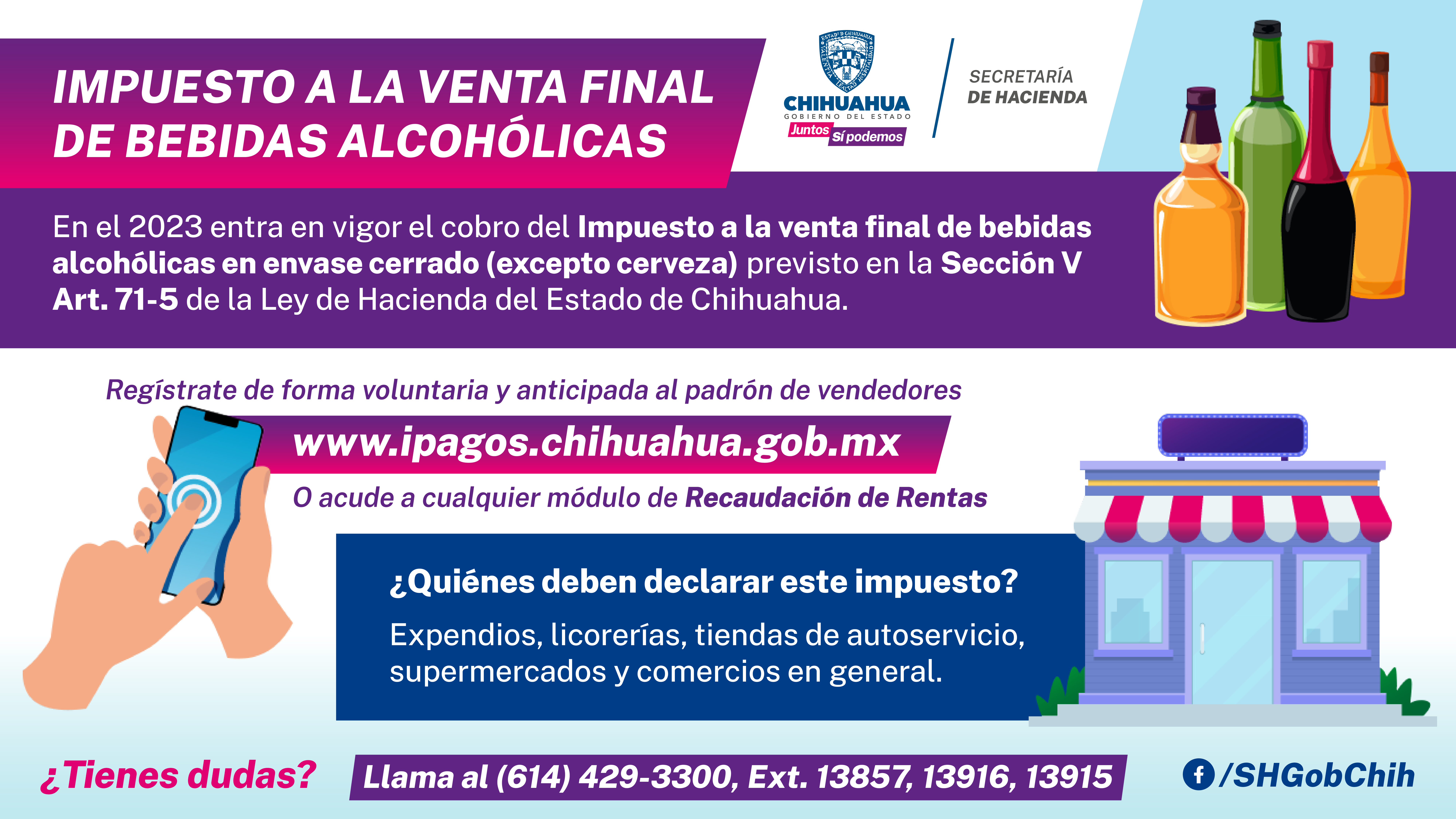 La Secretaría de Hacienda de Gobierno del Estado informa que a partir del 2023 entrará en vigor el cobro del “Impuesto a la venta final de bebidas alcohólicas” en envase cerrado (excepto cerveza), previsto en la Sección V Art.71.5 de la Ley de Hacienda del Estado de Chihuahua.