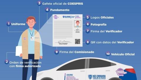 Todo personal autorizado de Coespris debe contar con un vehículo oficial rotulado, gafete oficial vigente, uniforme institucional y una orden de verificación debidamente fundamentada y por escrito.
