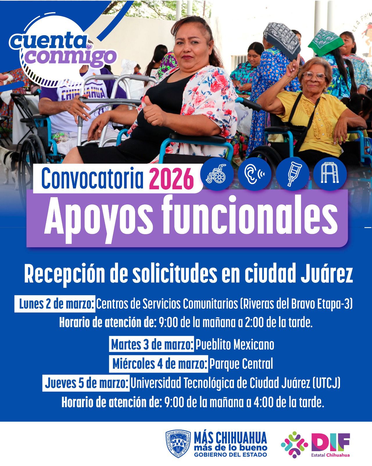 El Gobierno del Estado, a través del DIF Estatal en Ciudad Juárez, arrancará el próximo lunes 2 de marzo con el registro de personas que requieren aparatos funcionales, mismos que serán entregados de forma gratuita gracias al Programa de Beneficencia Pública 2026.