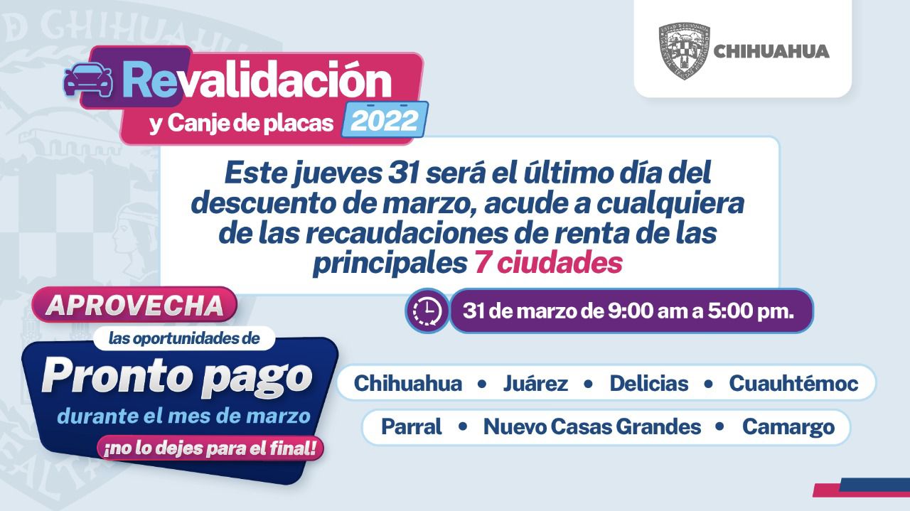 La Secretaría de Hacienda de Gobierno del Estado, informó que este jueves 31 de marzo, es el último día para aprovechar las oportunidades de pronto pago en revalidación y cambio de placas.
