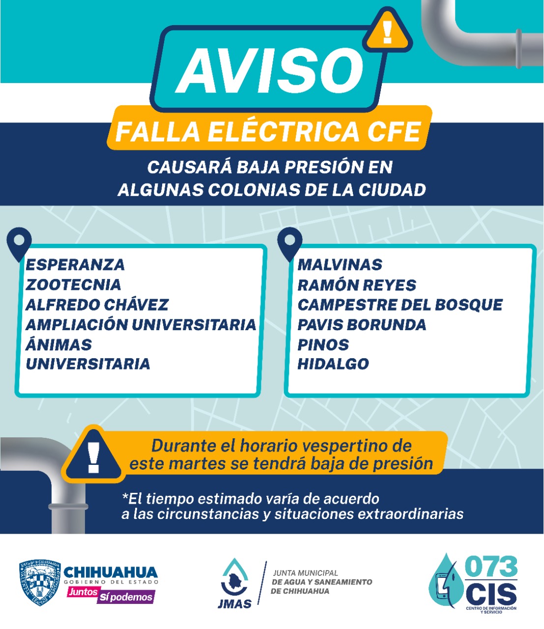 La JMAS de Chihuahua solicita comprensión a los usuarios que puedan verse afectados ante esta situación y reitera que se trabaja para el restablecimiento del servicio.
