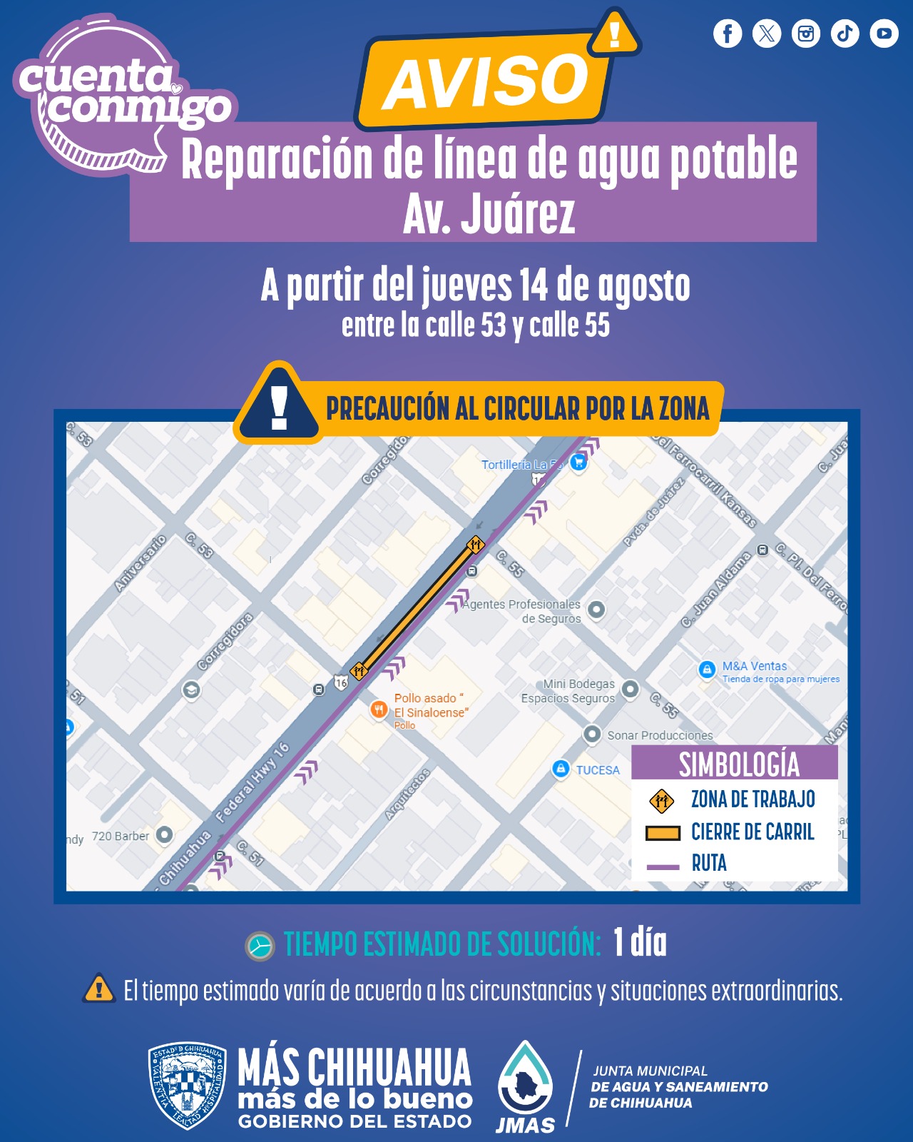 JMAS Chihuahua llama a los automovilistas a respetar en todo momento los señalamientos que se colocarán en ambas áreas, y a conducir con precaución para evitar accidentes.