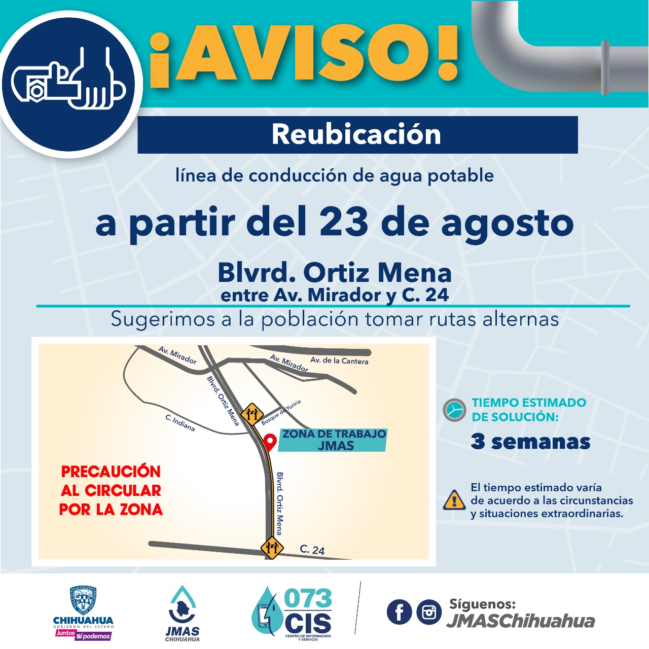 La Junta Municipal de Agua y Saneamiento (JMAS), pidió a los automovilistas que circulan por la lateral del boulevard Ortiz Mena, entre la calle 24 y avenida Mirador, tomar las debidas precauciones ya que se realizan trabajos para reubicar una línea de conducción de agua potable.