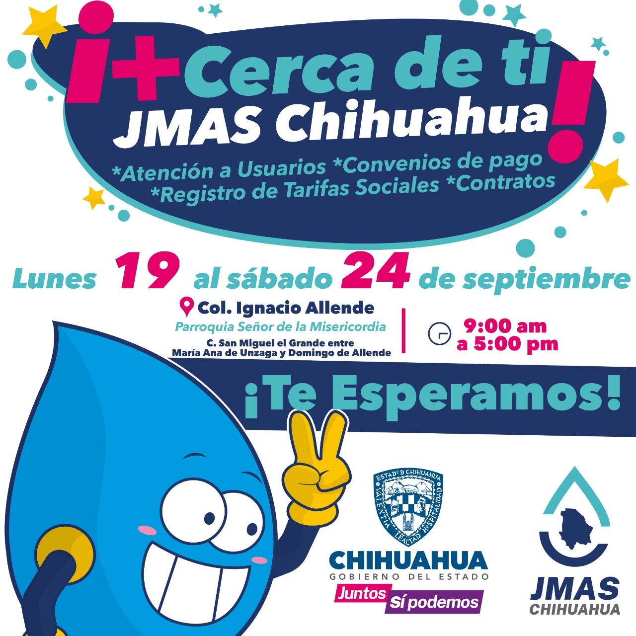La Junta Municipal de Agua y Saneamiento (JMAS) de Chihuahua, instalará una sucursal móvil en la colonia Ignacio Allende, en la calle San Miguel el Grande entre las calles María Ana de Unzaga y Domingo de Allende, frente a la parroquia del Señor de la Misericordia.