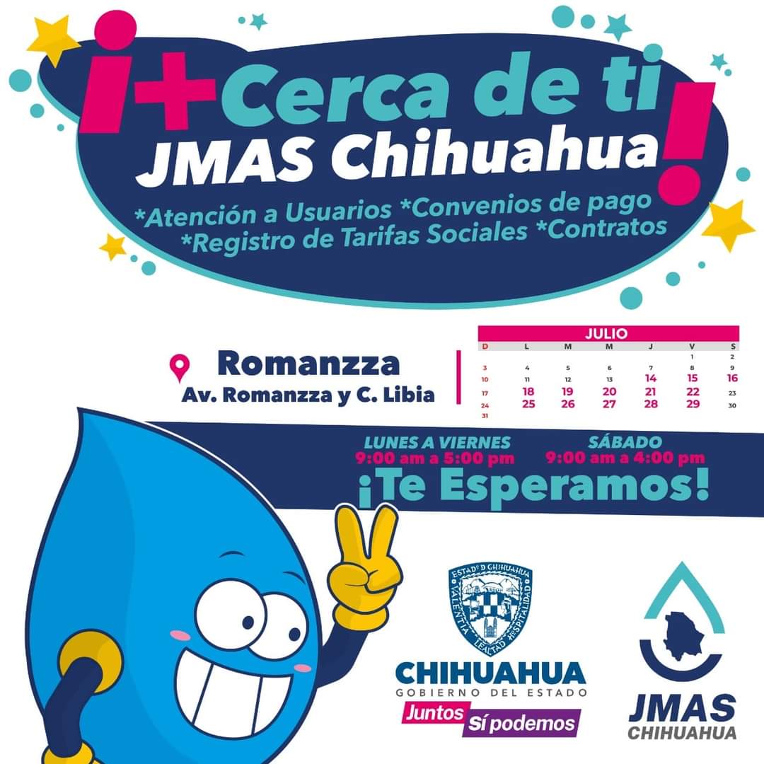 La Junta Municipal de Agua y Saneamiento (JMAS) de Chihuahua, instalará una sucursal móvil en el cruce de la avenida Romanzza y calle Libia, a fin de acercar a la ciudadanía los diversos trámites como son: contratos del servicio, convenios de pago, registro de tarifas sociales, asesoría del área de trabajo social y cajeros para efectuar el pago de recibos.
