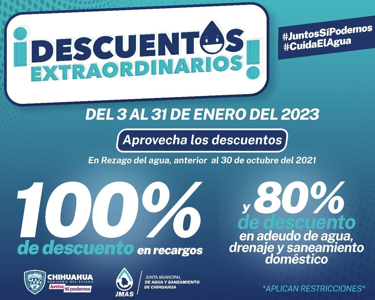 La Junta Municipal de Agua y Saneamiento (JMAS) de Chihuahua invita a los usuarios que registren adeudos anteriores al 30 de octubre de 2021, a acercarse a las sucursales del organismo a fin de aprovechar los últimos 15 días de descuentos.