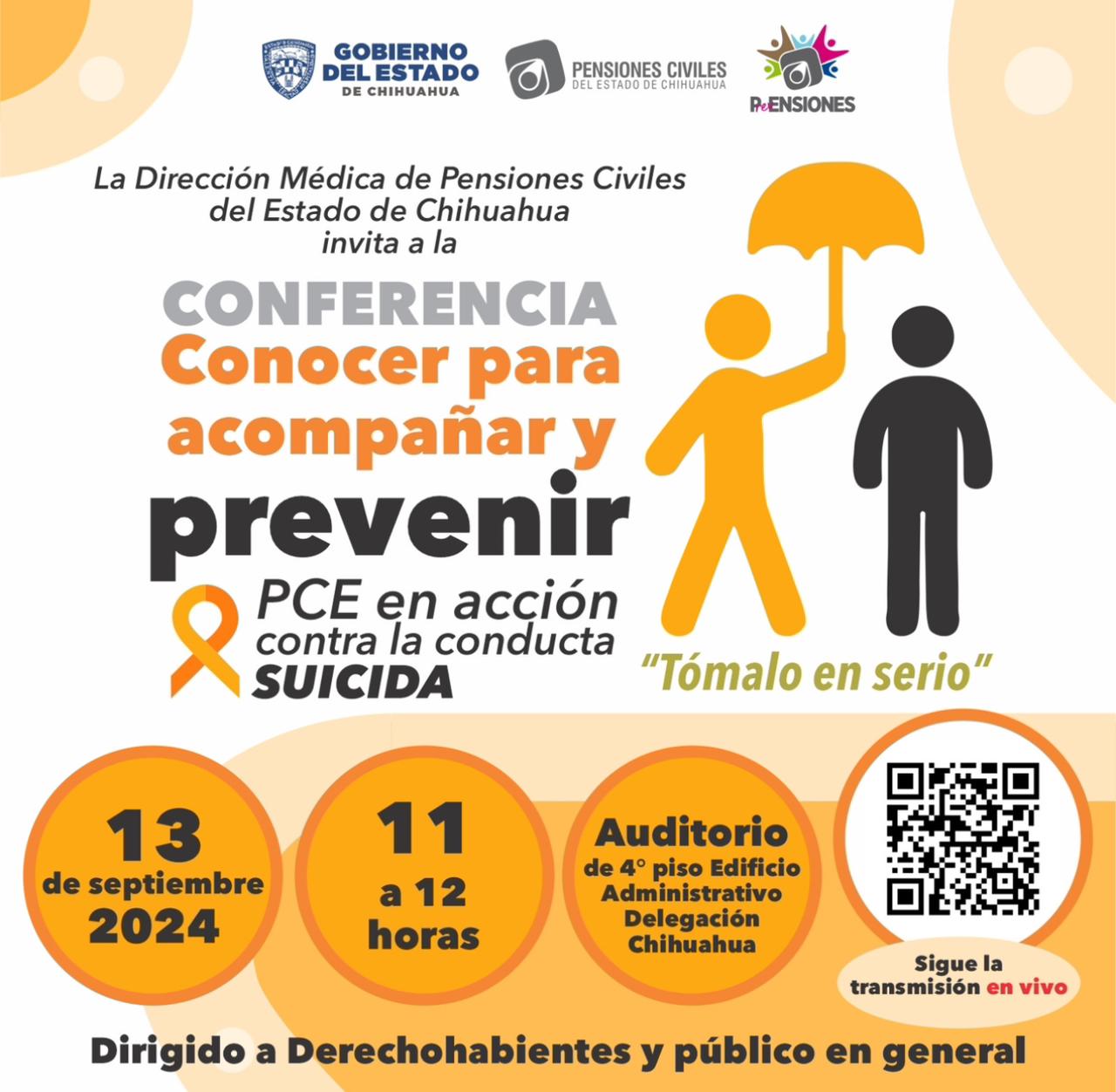 En el marco del Día Mundial de la Prevención del Suicidio, que se conmemora el 10 de septiembre, la Dirección Médica de Pensiones Civiles invita a la población derechohabiente y público en general a la conferencia “Conocer para acompañar y prevenir el suicidio”.