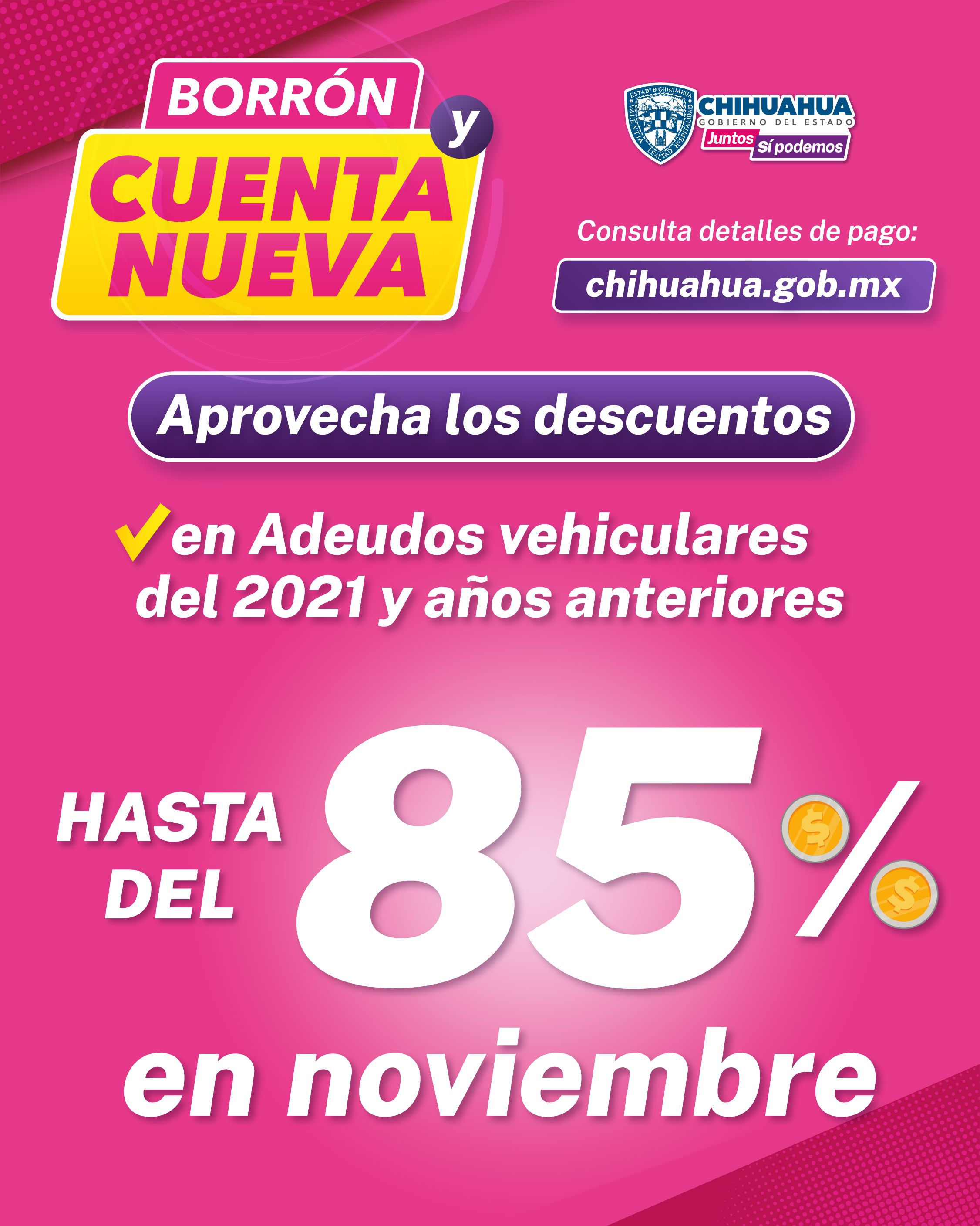 La Secretaría de Hacienda invita a los propietarios de automóviles que tengan multas de tránsito para que aprovechen los beneficios del programa “Borrón y cuenta nueva”, el cual ofrece descuentos en multas no graves hasta del 60 por ciento durante el mes de noviembre.