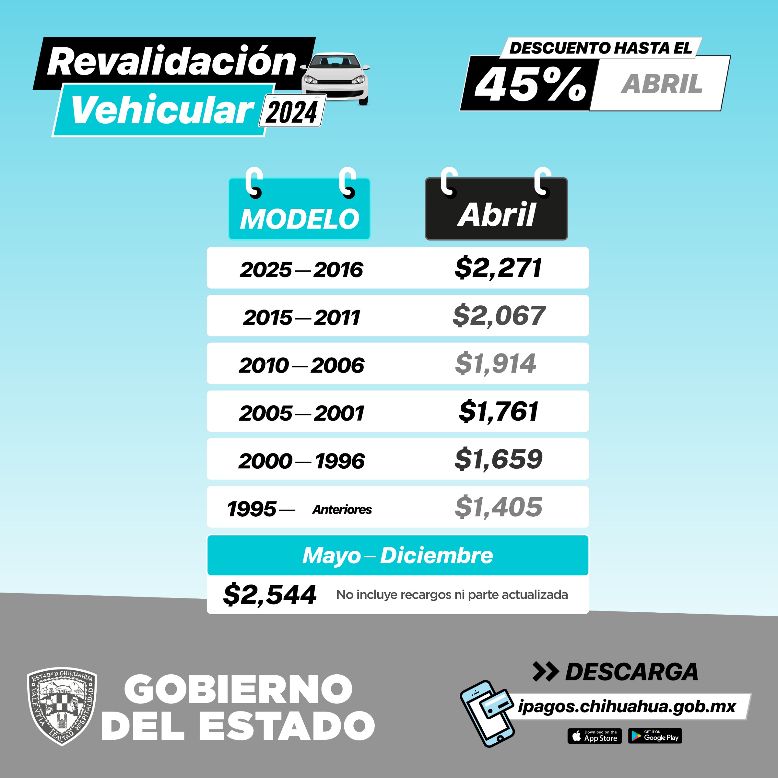 Es importante recordar que, a partir del 1 de mayo, el costo de la revalidación vehicular será de 2 mil 544 para todos los modelos de vehículo.