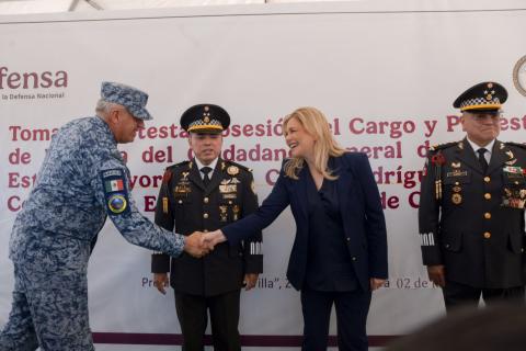 La gobernadora Maru Campos asistió como invitada especial a la toma de protesta del general de brigada, Diplomado de Estado Mayor, Israel Caro Rodríguez, como nuevo coordinador estatal de la Guardia Nacional en Chihuahua.