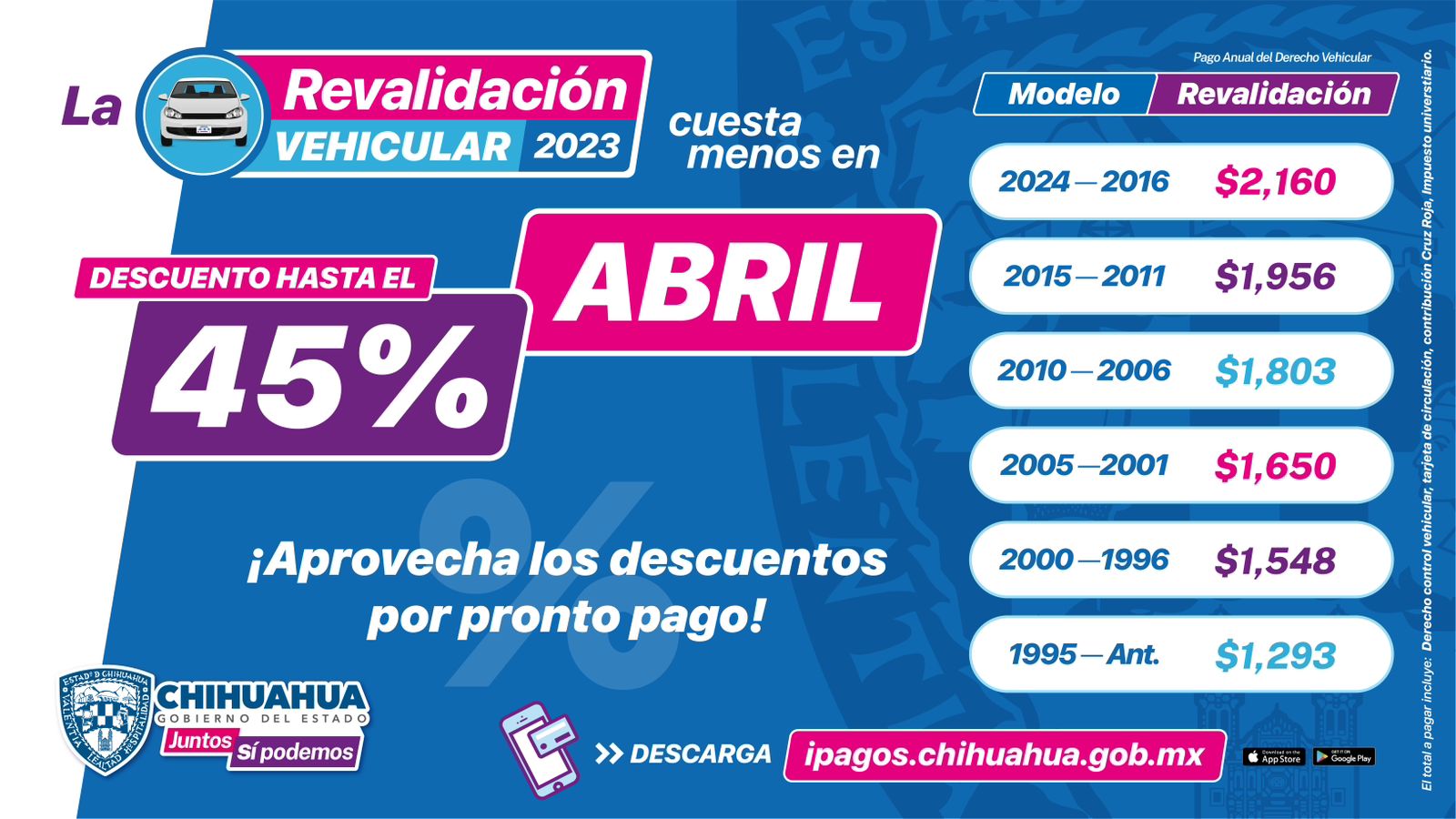 Además, se informó que a partir del mes de mayo, el costo de la revalidación vehicular será de 2 mil 433 pesos para todos los modelos de vehículos, por lo que es importante recordar que en abril los modelos más recientes 2024-2016 se deberá cubrir un monto de 2 mil 160 pesos, en vehículos del 2015 al 2011 el costo es de mil 956 pesos, del 2010 al 2006 es de mil 803 pesos, del 2005 al 2001 de mil 650, del 2000 a 1996 de 1548 y todos los modelos del 1995 y años anteriores deberán pagar mil 293 pesos.
