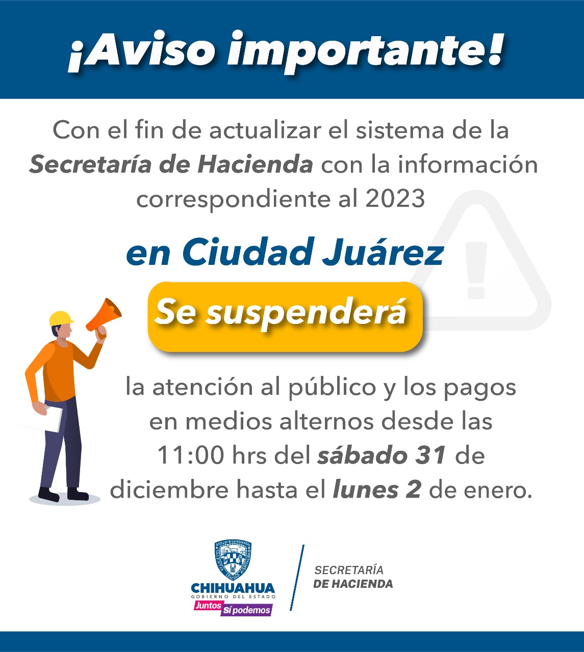 Debido a la actualización del sistema de la Secretaría de Hacienda a nivel estatal, el próximo sábado los módulos de Recaudación de Rentas en Ciudad Juárez solo se atenderá hasta las 11 de la mañana, esto derivado de la diferencia de horario con la Capital del Estado.
