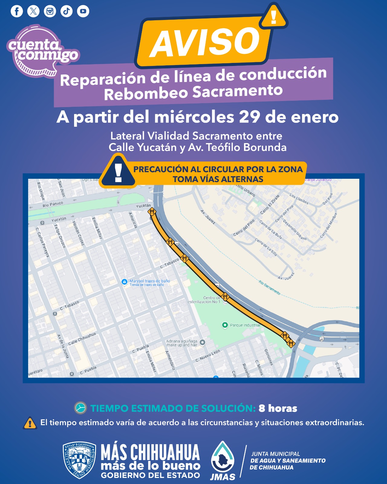 La Junta Municipal de Agua y Saneamiento (JMAS) de Chihuahua informó que este miércoles 29 de enero, llevará a cabo los trabajos de reparación en un tramo de la línea de conducción de agua potable, que conecta el rebombeo Sacramento con el rebombeo Coronel.