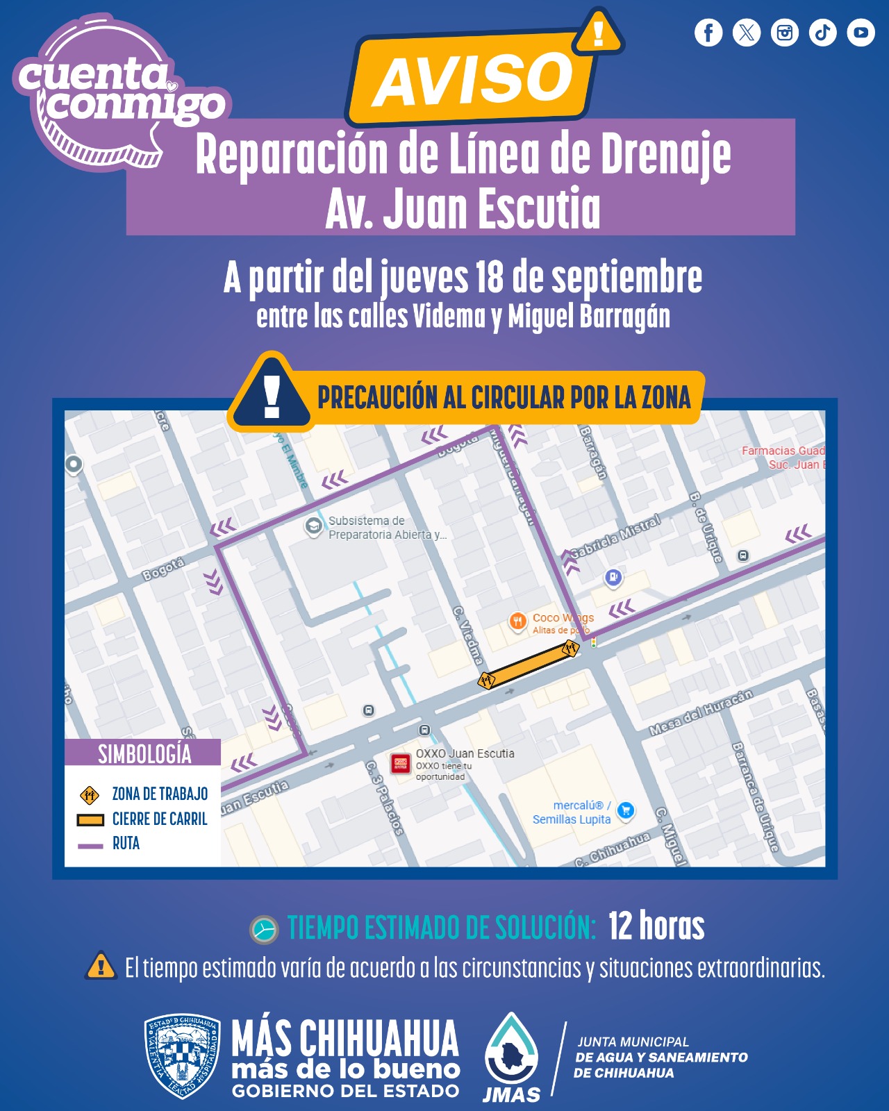 La Junta Municipal de Agua y Saneamiento (JMAS) de Chihuahua informó que este jueves 18 de septiembre llevará a cabo los trabajos de reparación de un tramo de tubería de drenaje en la avenida Juan Escutia, entre las calles Viedma y Miguel Barragán.