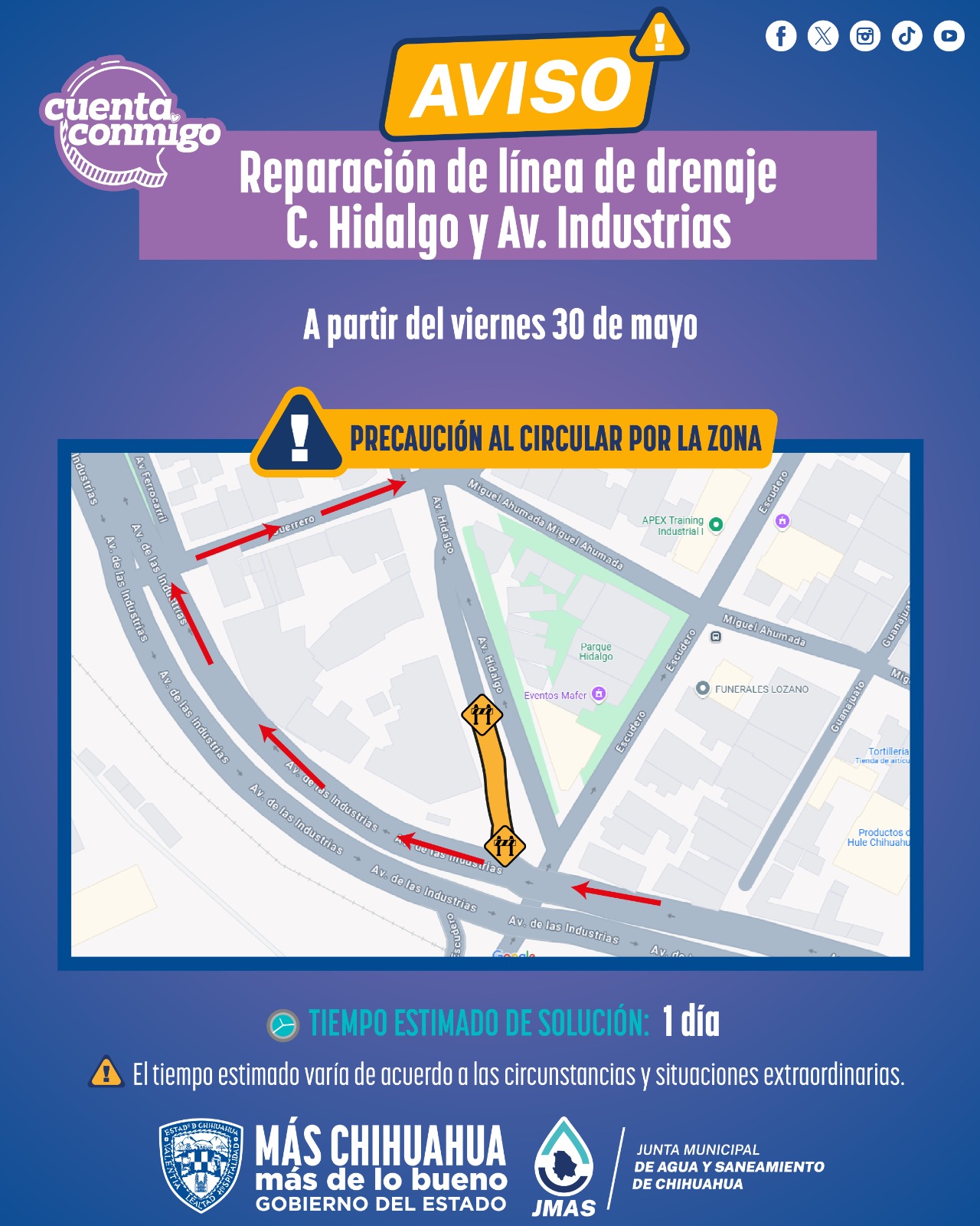La Junta Municipal de Agua y Saneamiento (JMAS) de Chihuahua, dio a conocer que este viernes 30 de mayo realizarán trabajos de reparación en la línea de drenaje en la calle Hidalgo y avenida Industrias, en la colonia Industrial.
