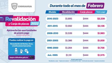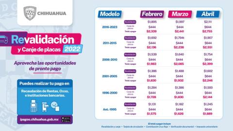 La Secretaría de Hacienda informa que hasta el próximo 31 de marzo, el canje de placas para todos los modelos tiene un costo de 444 pesos, más lo correspondiente a la Revalidación Vehicular.