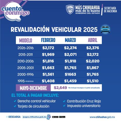 Durante el mes de abril, las y los contribuyentes propietarios de vehículos, cuyos modelos oscilan entre 2016 y 2025, deberán pagar 2 mil 376 pesos; de 2011 a 2015 son 2 mil 172 pesos y de 2006 a 2010 pagarán 2 mil 020 pesos.