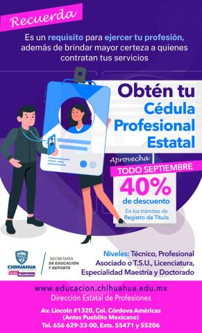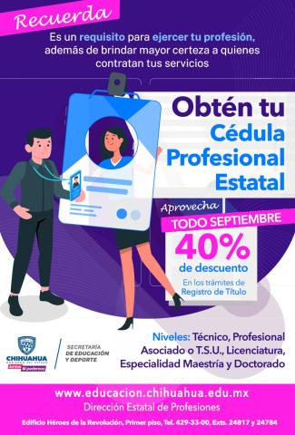La Secretaría de Educación y Deporte (SEyD) informa que durante el mes de septiembre se ofrecerá un descuento del 40 por ciento en los trámites de registro de título y expedición de la Cédula Profesional Estatal, gracias a las gestiones realizadas ante la Secretaría de Hacienda.